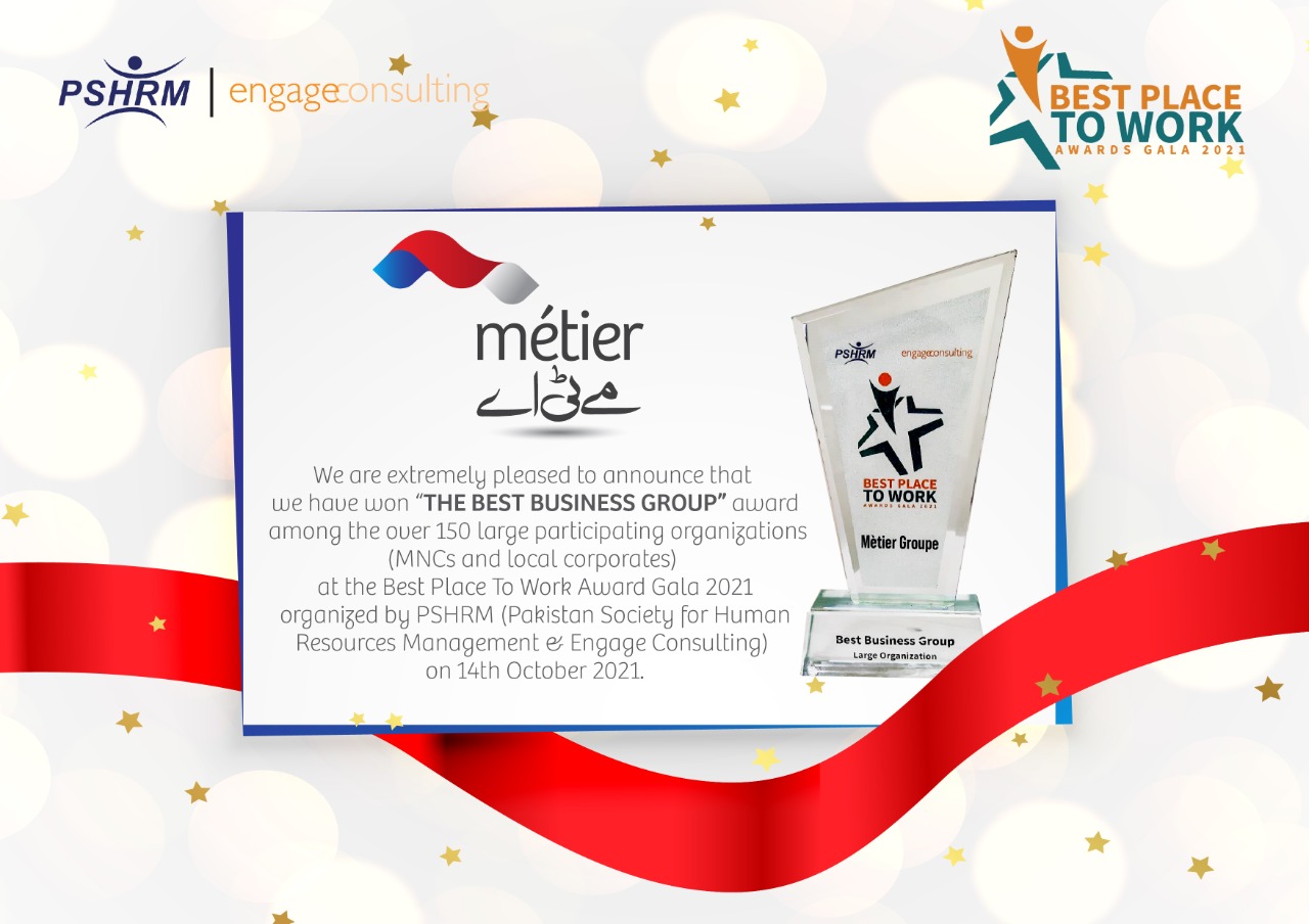 We are delighted to share this great news with all of you that Métier Groupe has won the “Best Business Group” category Award at Best Place to Work Gala 2021 Held at Beach Luxury Hotel on October 14, 2021.