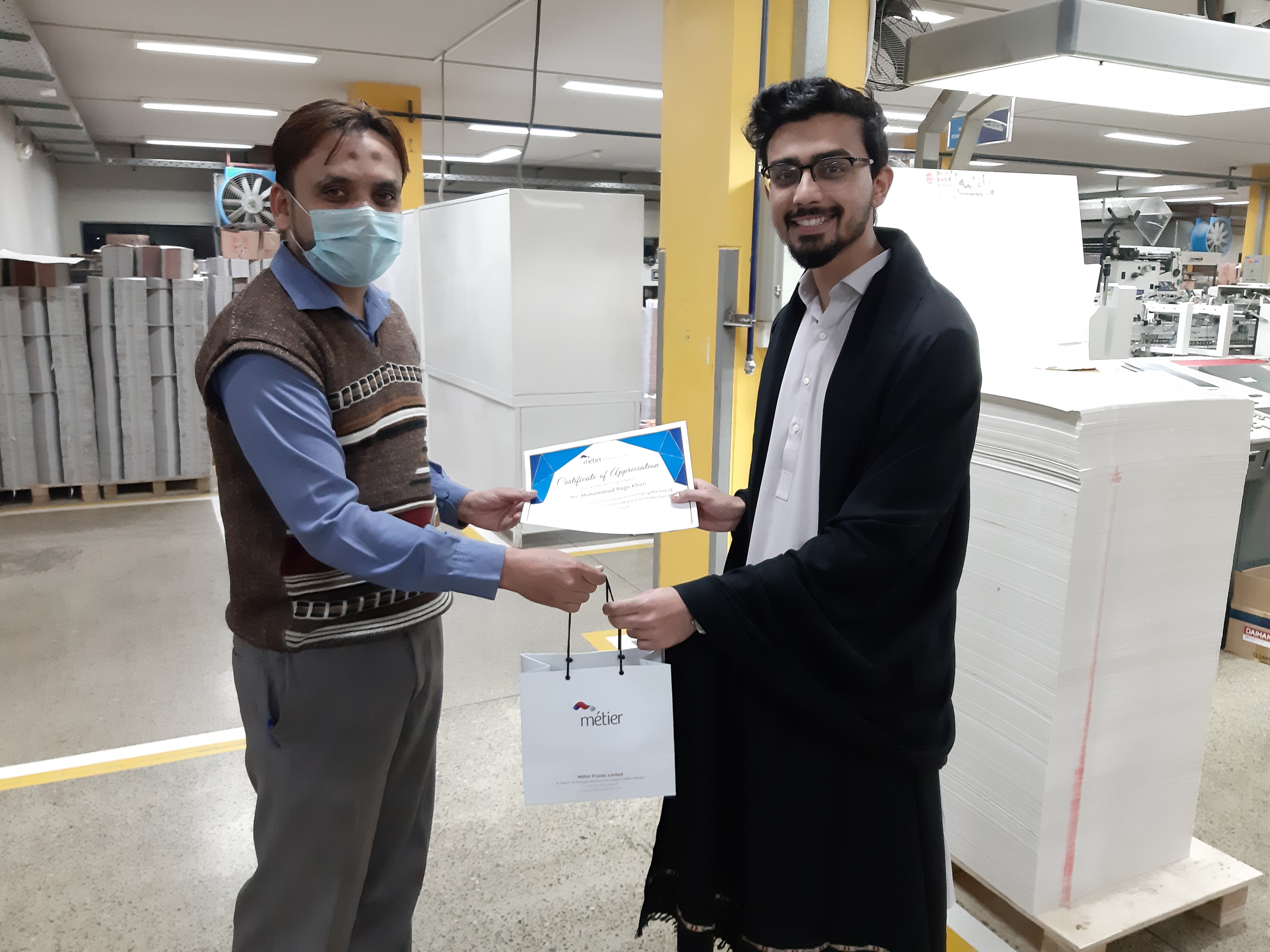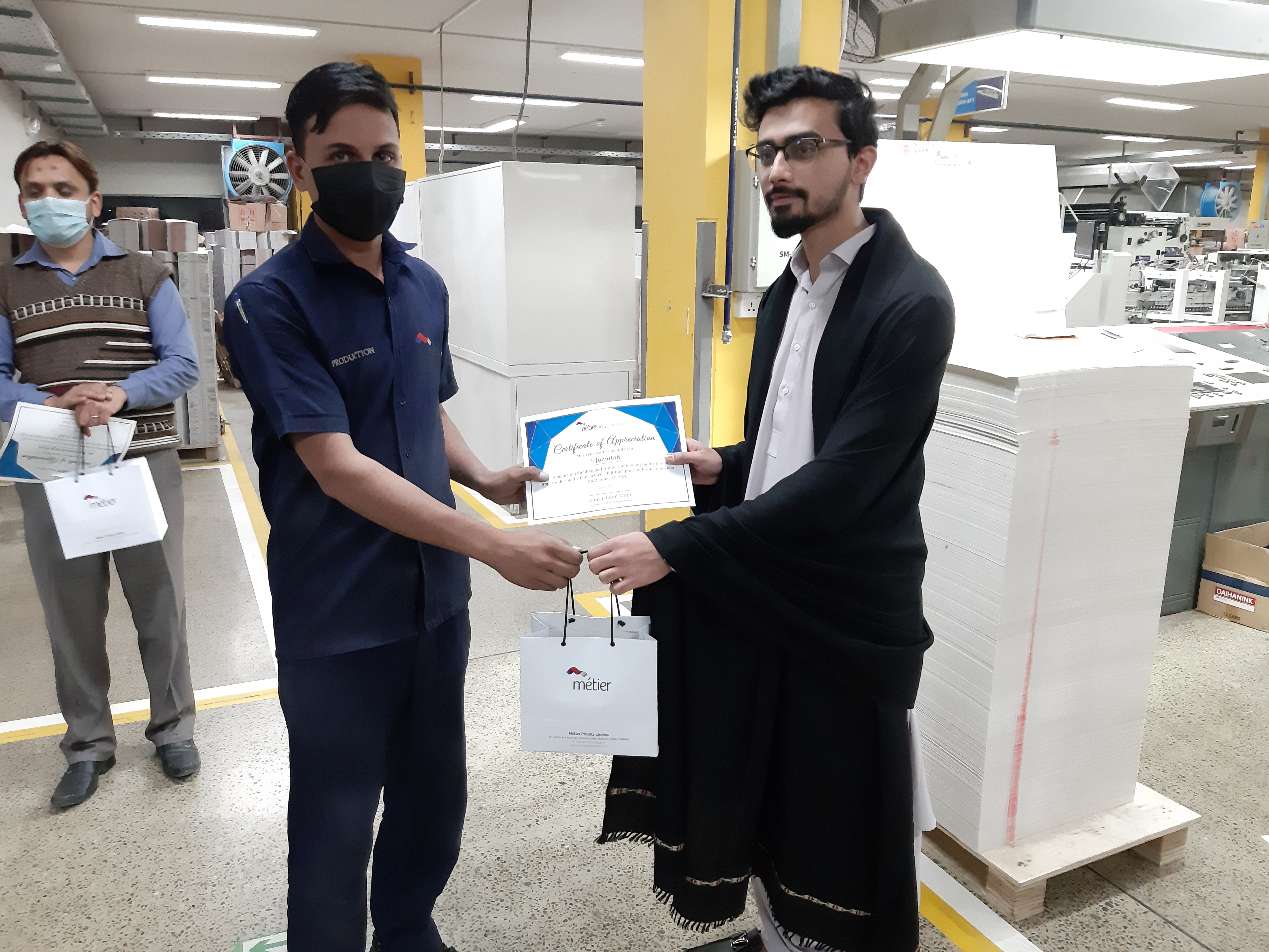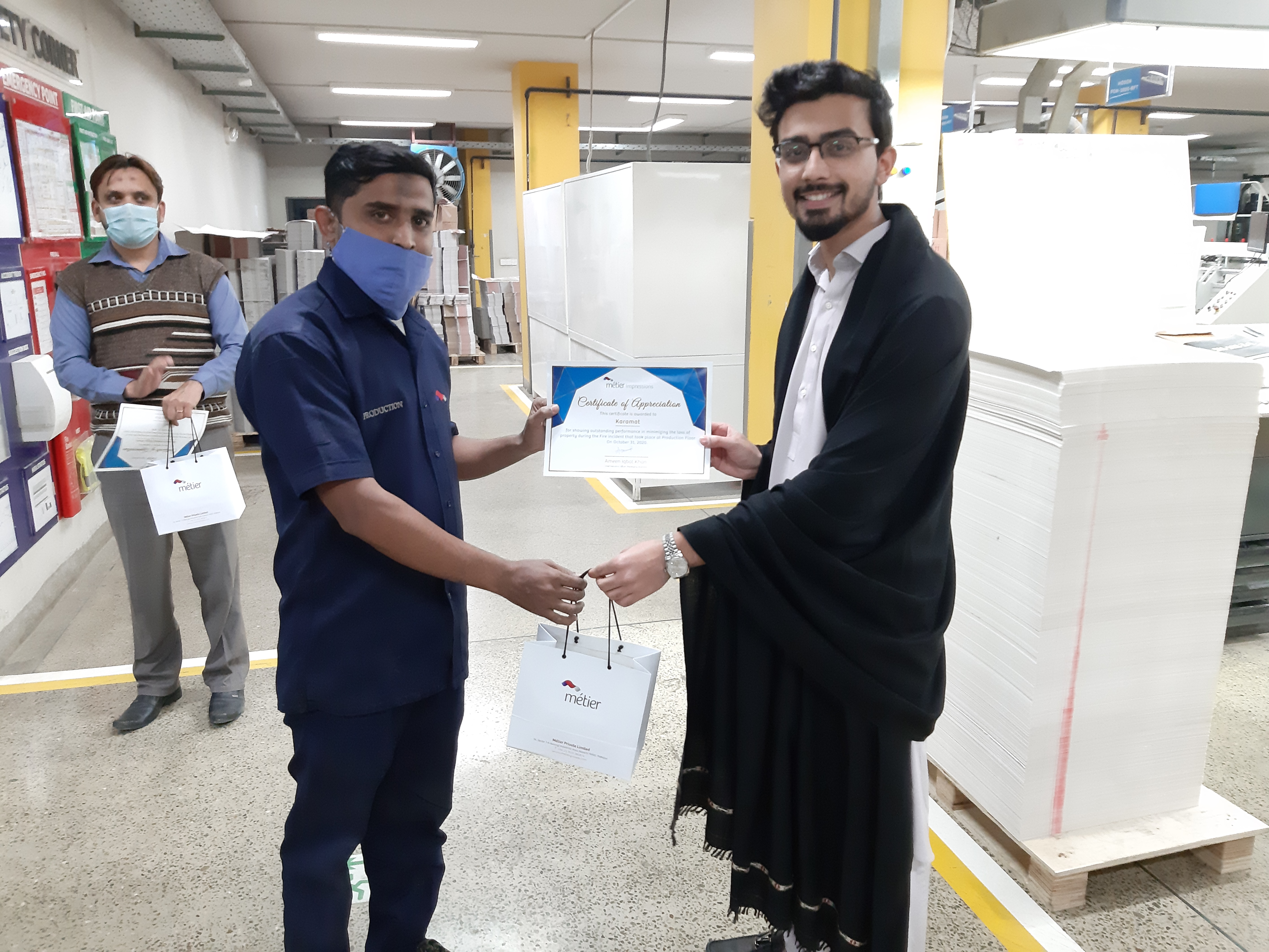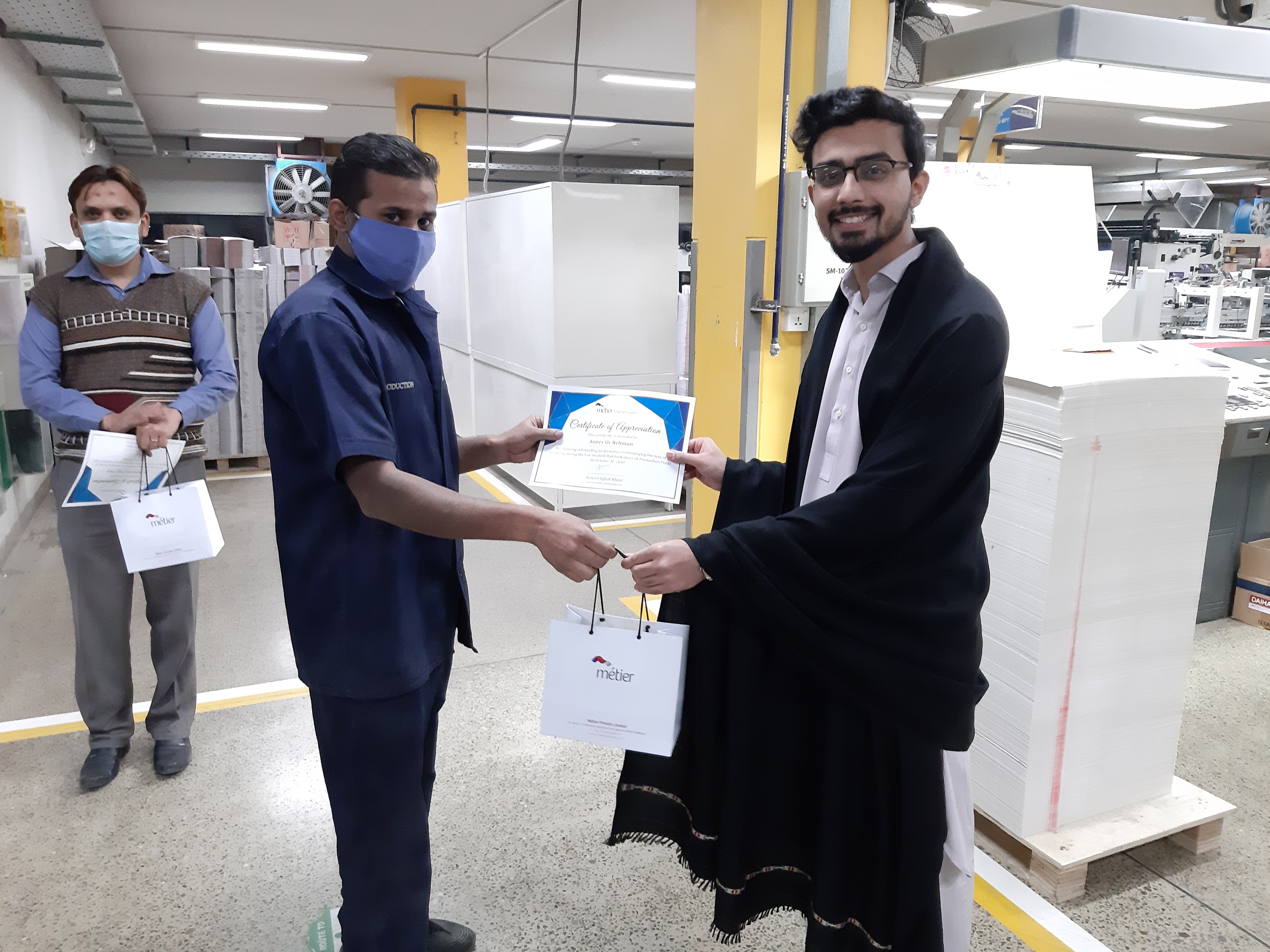 Recently our respected CEO of Packaging Business, distributed Certificates of appreciation coupled with a gift hamper to the employees of Métier Impressions for their contribution in ensuring safety at their workplace.